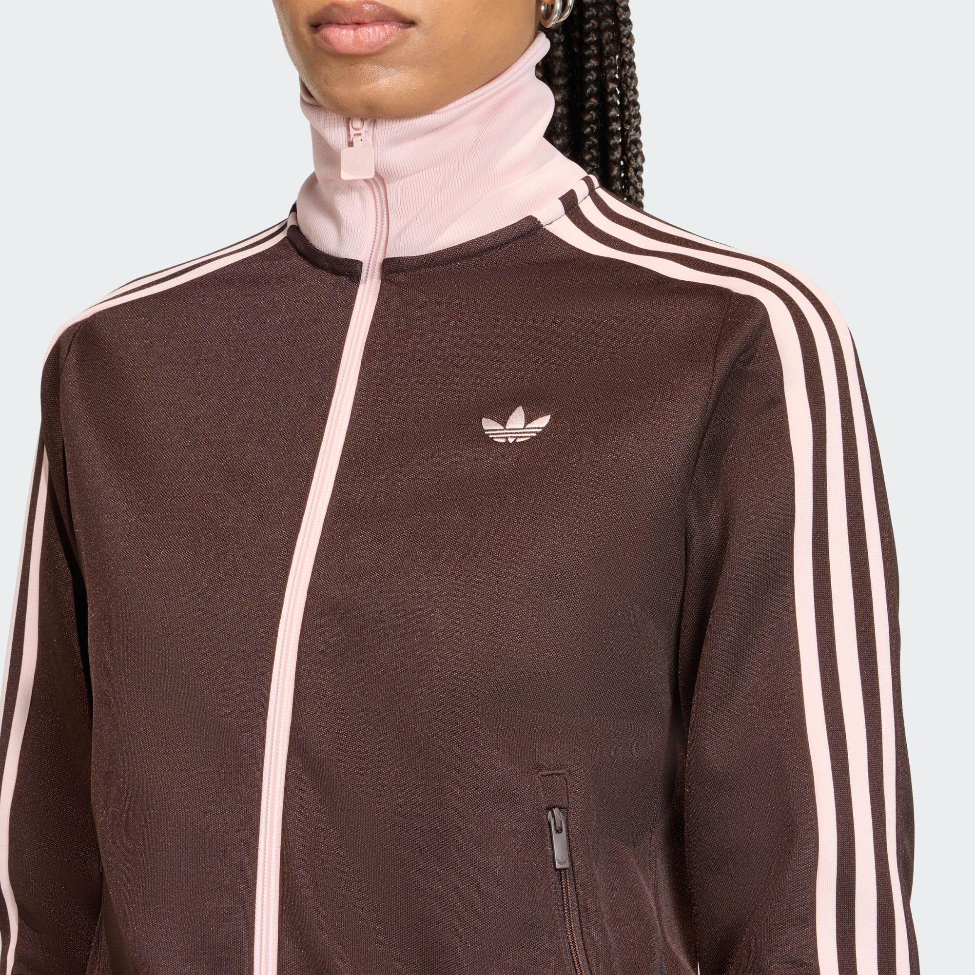 Una emblemática silueta de chaqueta deportiva con las 3 Rayas con cuello de embudo para siempre cubierto y estilo.