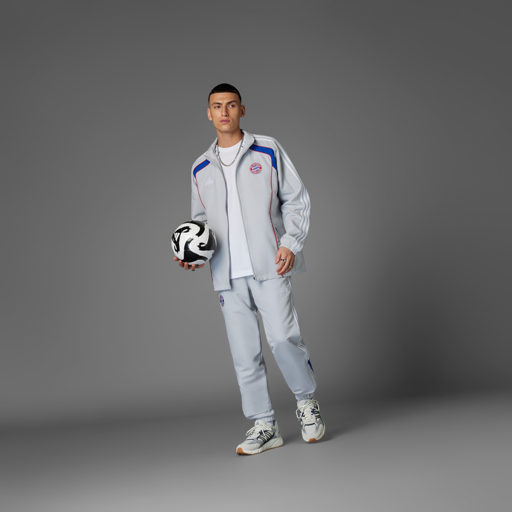 Una chaqueta deportiva del FC Bayern con un estilo futbolístico de herencia, fabricada con materiales reciclados.