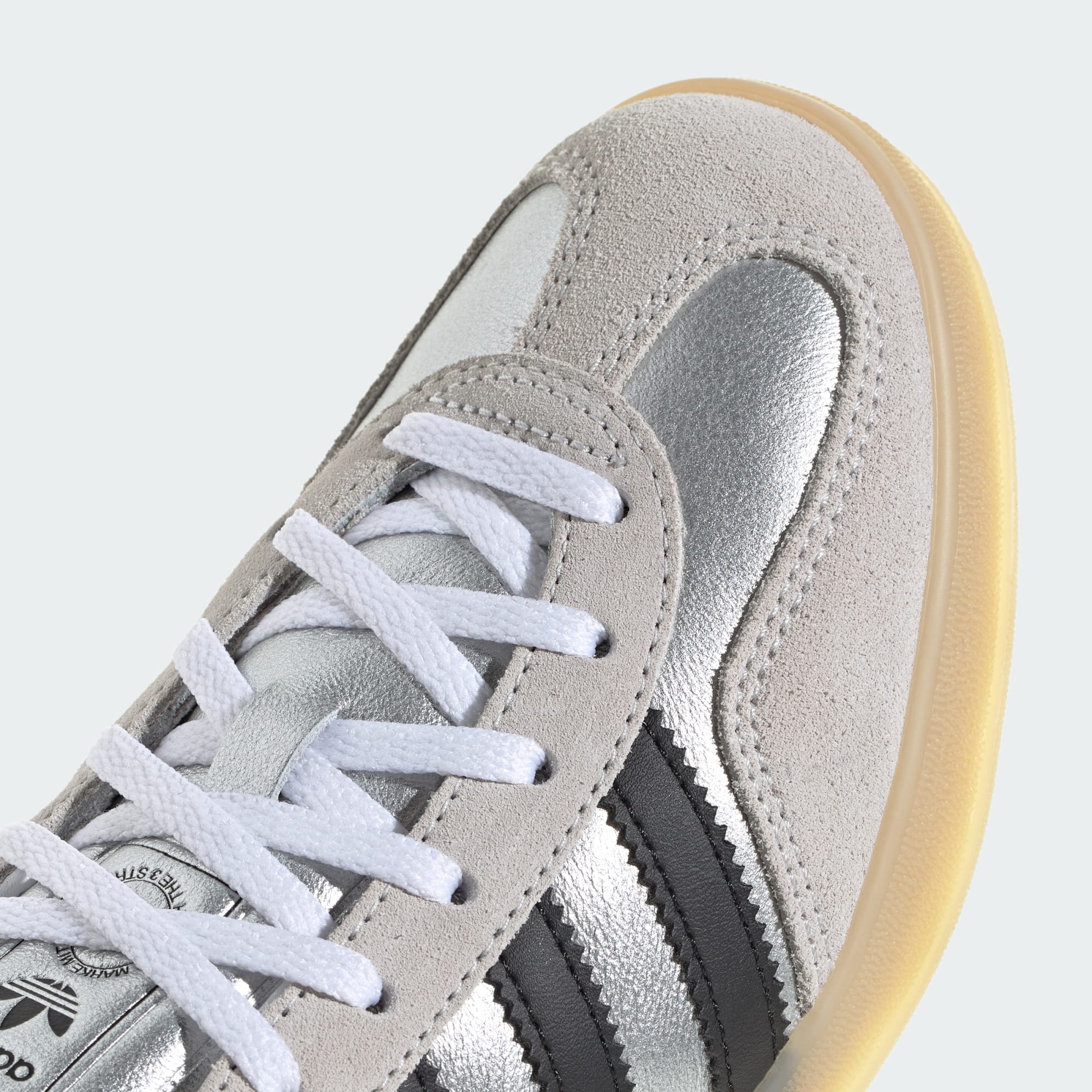 Calzado adidas de archivo realizado en cuero metálico brillante.